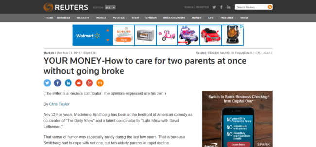 What is a more difficult job than caregiving for adults? Here I am quoted on the importance of getting (sometimes hiring) help if you are caught between caring for aging parents, your own kids, and keeping your career afloat. http://www.reuters.com/article/eldercare-parents-tips-idUSL1N13E33Z20151123#883t7t7tUiVW0hJa.9712 Contact me at 303-324-0014 or kristi@sullivanfinancialplanning.com to talk about how I can help you achieve your retirement…