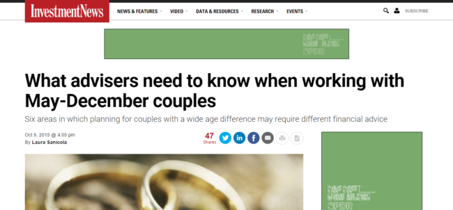 Even your love life becomes important in financial planning. Here is an article in Investment News where I am quoted talking about some things to be aware of when planning for couples with a large age gap. You have to log in to read the whole article, but it’s free. http://www.investmentnews.com/article/20151009/FREE/151009924 Contact me at 303-324-0014…